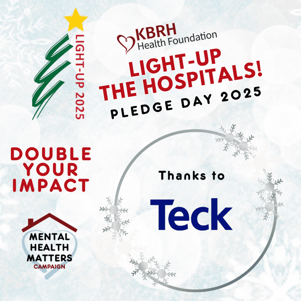 FOR IMMEDIATE RELEASE KBRH Health Foundation Receives $100,000 Matching Donation from Teck for Mental Health Matters Campaign Trail, BC (November 20, 2025) – The KBRH Health Foundation is excited to announce that this year’s Light-Up the Hospitals! Pledge Day receives a tremendous boost, as Teck generously matches donations up to $100,000—doubling the impact of every gift.