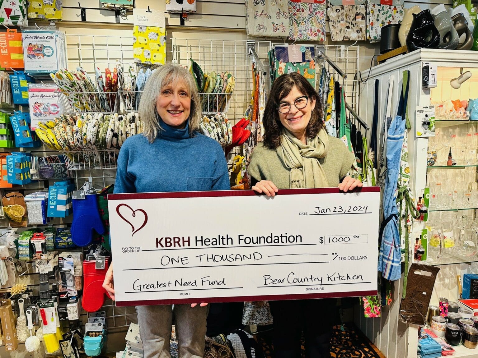 Bear Country Kitchen in Rossland has generously donated $1,000 to the Greatest Need Fund. The funds were raised during the annual Red Thursday event—an evening of shopping aimed at supporting local businesses. Bear Country Kitchen showed their commitment to community health and wellness by matching all donations made to the KBRH Health Foundation that evening. Lisa Pasin, KBRH Health Foundation Executive Director accepts this donation from Dawn Manning, Bear Country Kitchen Owner (right to left). This kind gesture goes a long way toward building quality local healthcare