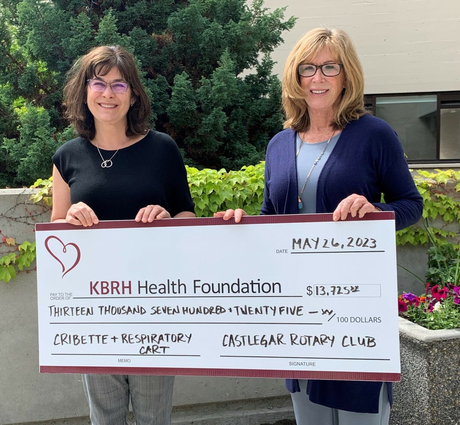 The Castlegar Rotary Club has generously donated $13,723.25 to the KBRH Health Foundation’s Tier 3 Neonatal Intensive Care Unit Project. These funds, raised during the Rotary’s Bingo program offered during the pandemic, will purchase a cribette and respiratory cart for the Tier 3 Nursery. Franca Berdusco, Castlegar Rotary Member presents their donation to Lisa Pasin, KBRH Health Foundation Executive Director (right to left).