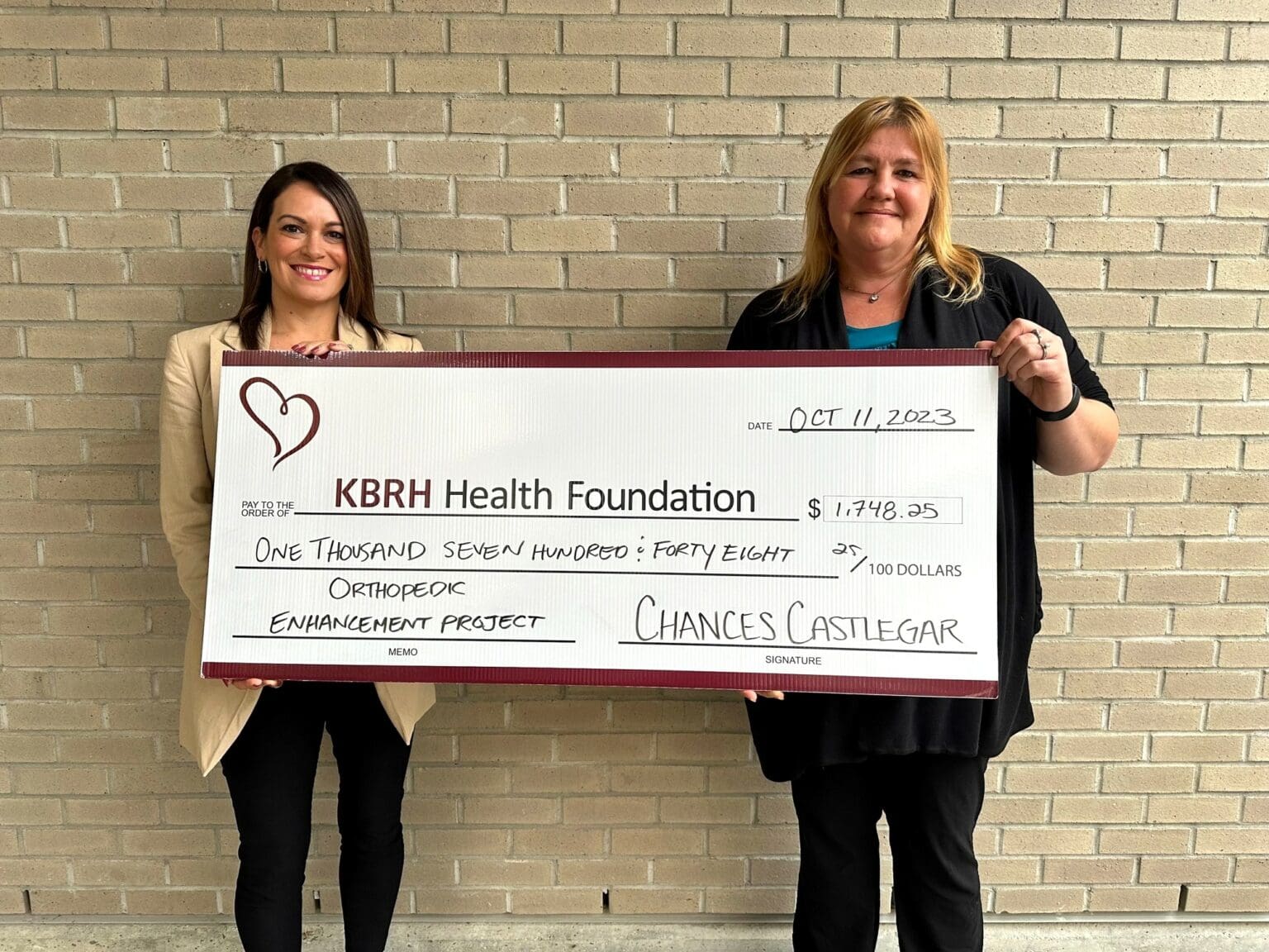 Chances Castlegar has generously donated $1,748.25 towards the KBRH Health Foundation’s Orthopedic Enhancement Project raised through their “Found Money” program. The $750,000 Orthopedic Enhancement Project will purchase state of the art medical equipment for the Operating Rooms at Kootenay Boundary Regional Hospital. Lisa Babcock, KBRH Health Foundation Board Member, accepts this cheque from Jennifer Farnum, Chances Castlegar General Manager (left to right).