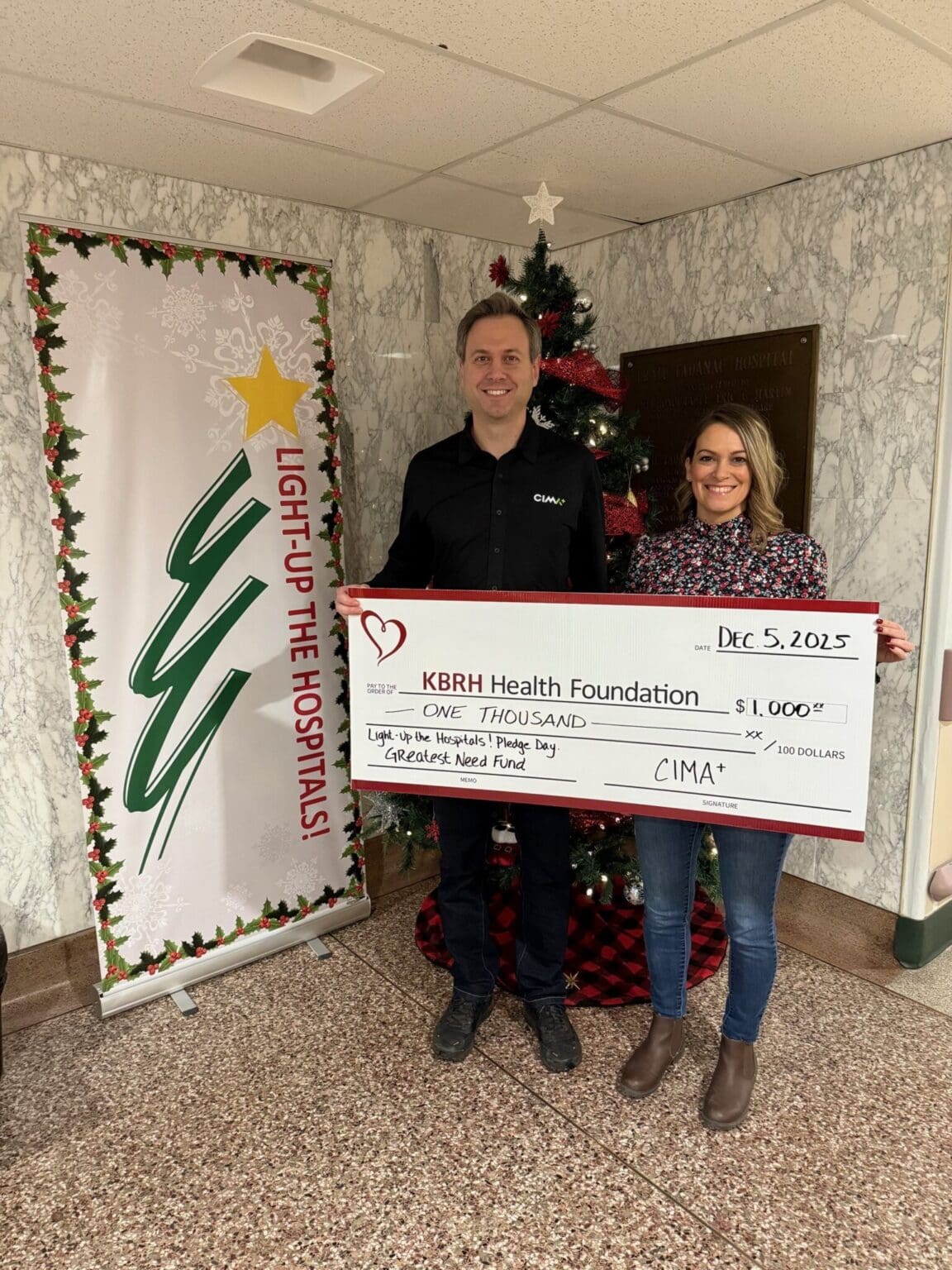 CIMA+ added to the momentum of Light-Up the Hospitals! Pledge Day with a generous $1,000 donation to the Greatest Need Fund, helping provide flexibility to respond to urgent equipment replacements, patient care priorities, and emerging needs at KBRH. Zachary Job, Electrical Manager at CIMA+, presented the donation to Lisa Babcock, KBRH Health Foundation Second Vice Chair (left to right). With Teck’s matching gift, this contribution will have an even greater impact on patients and families across our region. Thank you, CIMA+, for your commitment to strengthening local healthcare!