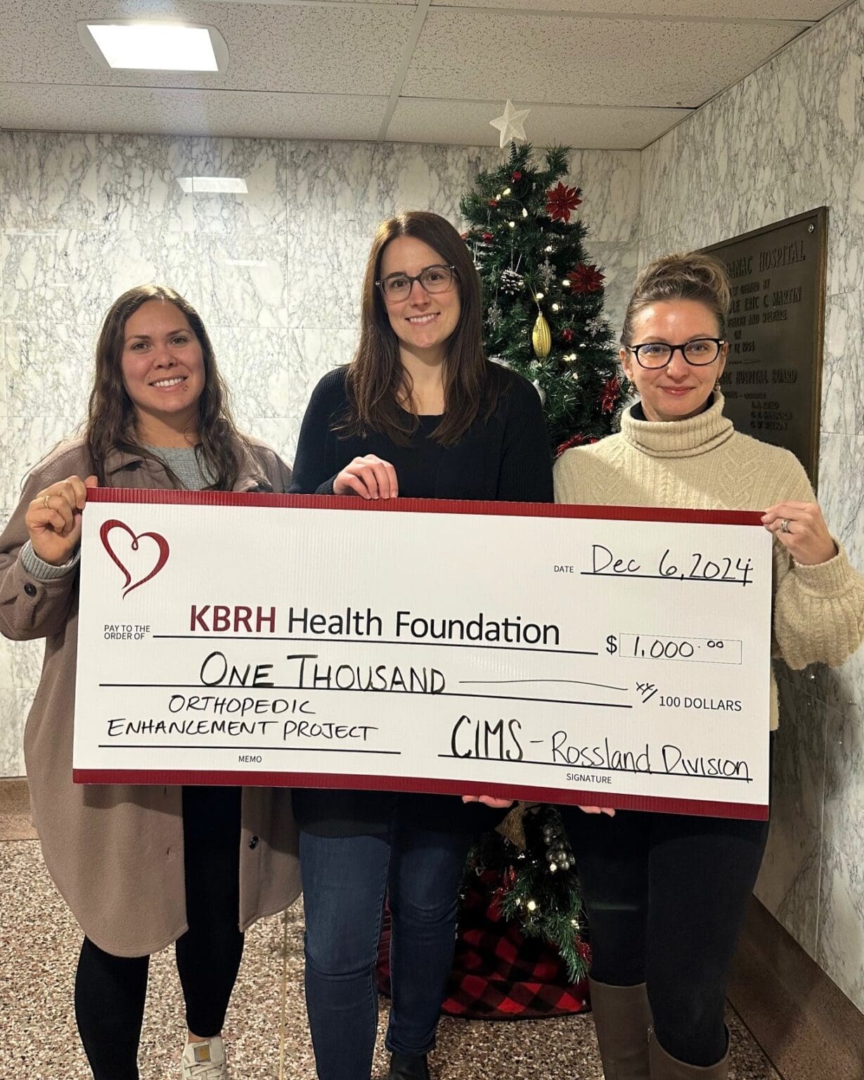 CIMS Rossland Division has generously donated $1,000 to the Orthopedic Enhancement Project as part of the Light-Up the Hospitals campaign. This year, all donations to the project are matched by Jim Pattison, doubling the impact of every contribution. Pictured (left to right) are Sondra Marshall and Erin Proulx from CIMS Rossland Division presenting the donation to Andrea Dutchak, KBRH Health Foundation Board Director. Funds raised will bring cutting-edge orthopedic equipment to KBRH, improving care close to home.
