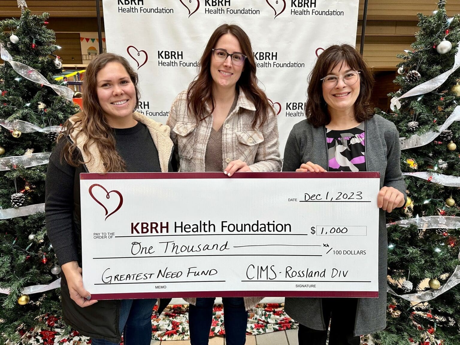 CIMS Rossland Division has donated $1,000 towards the Greatest Need Fund during Light-Up the Hospitals! Pledge Day. These funds will be used to help wherever the need is greatest, supporting a variety of departments at KBRH, Columbia View Lodge, Poplar Ridge Pavilion or Community Health. CIMS representatives Sondra Marshall and Erin Proulx present their donation to Lisa Pasin, KBRH Health Foundation Executive Director (left to right).