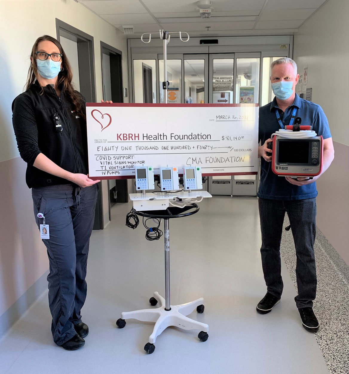 The KBRH Health Foundation is thankful to be a recipient of a grant from the CMA Foundation’s COVID-19 Community Hospital Fund. This generous donation of $81,140 has purchased a Vital Signs Monitor, 3 Battery Powered IV Pumps and a T1-Transport Ventilator. Jolene Bruce, Registered Nurse ICU and Greg Rollins, PPL Respiratory Services, accepted this donation and displayed the Ventilator and an IV Pump. This grant supports our hospital, our staff and our community.