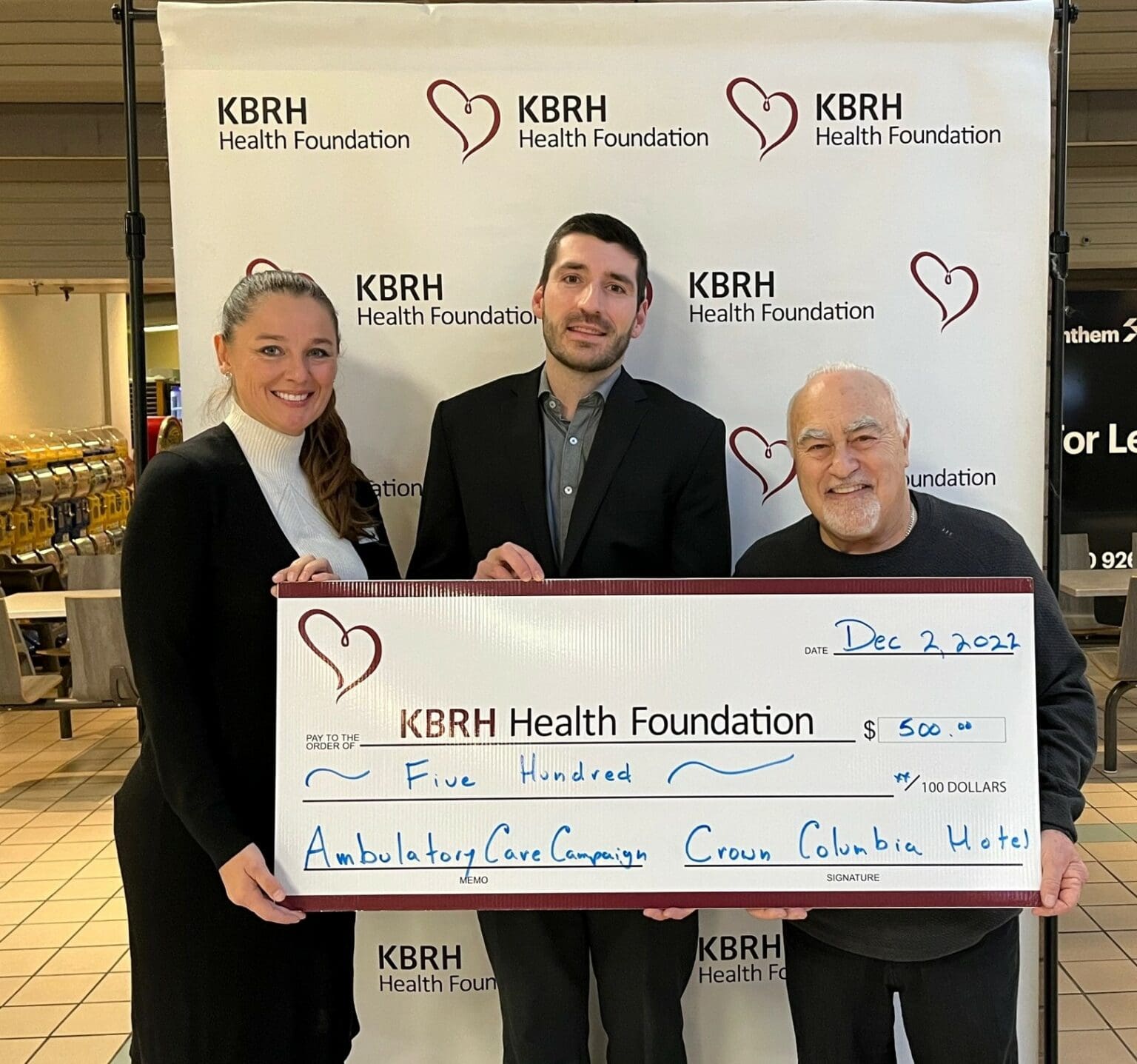 Hotel Manager, Adrian Heink (middle), donated $500 towards the Ambulatory Care Campaign on behalf of the Crown Columbia Hotel, BW Premier Collection. This donation is in support of Light-Up The Hospitals! Pledge Day. Kim Ferraro, KBRH Health Foundation Board Vice Chair (left) and Bernie Legatto, Board Treasurer (right), accept this donation.