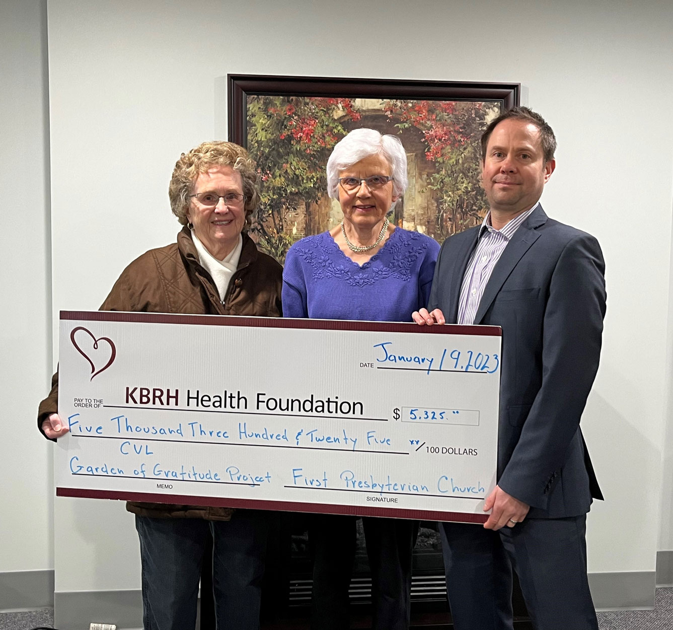 The KBRH Health Foundation has received a $5,325 donation from the members of the First Presbyterian Church of Trail. This donation will support the Columbia View Lodge Garden of Gratitude Project, prioritizing restoration of the garden courtyard areas at Columbia View Lodge, ensuring they are fully accessible and usable. Mission Committee Members, Lottie Bonin and Esther Brown presented this donation to Doug Sperry, KBRH Health Foundation Board Member (left to right).