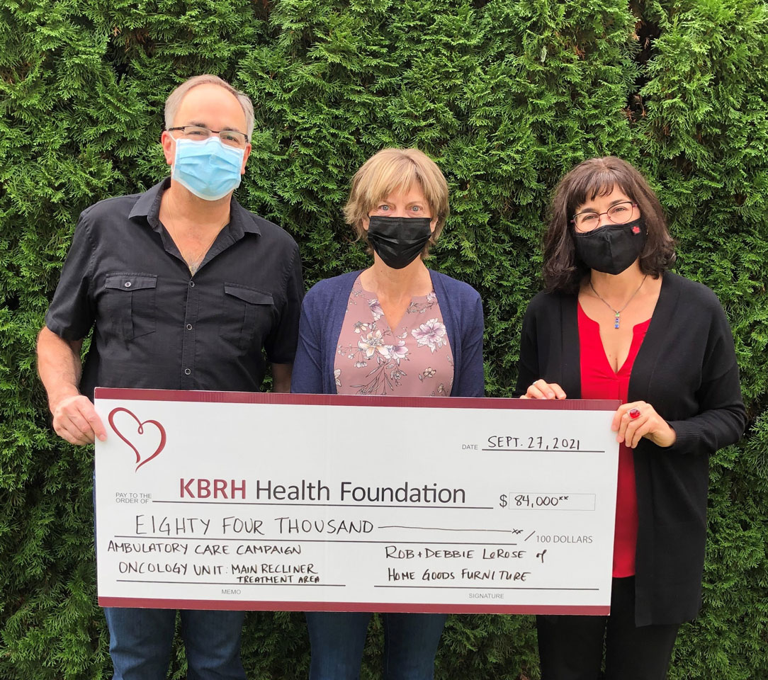 Rob and Debbie LeRose of Home Goods Furniture donated $84,000 to the Ambulatory Care Campaign. This donation will support the Main Recliner Treatment Area in the new Oncology Unit. Rob and Debbie LeRose (right and centre) presented this donation to Lisa Pasin, Executive Director (left), of the KBRH Health Foundation.