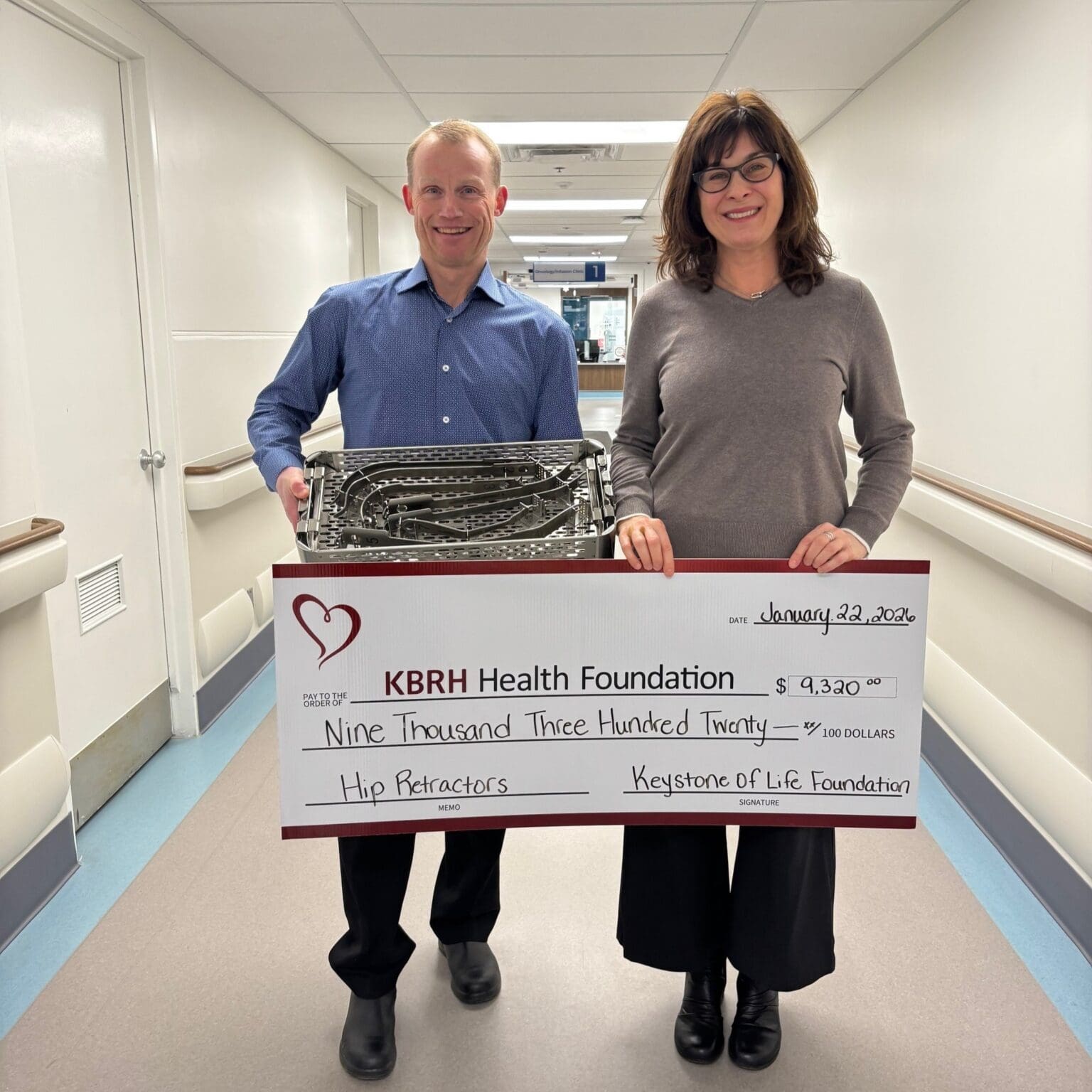 Thank you to the Keystone of Life Foundation for their very generous donation of $9,320 to purchase two Direct Anterior Retractor sets for the Orthopedic Department. These retractors are used during total hip replacements performed using the Direct Anterior Approach, a minimally invasive technique that allows surgeons to access the hip joint without cutting major muscles. The retractors help expose the hip and femur during surgery, increasing visibility for the surgeon and supporting safe, efficient procedures. By increasing the number of retractors available, the department can perform more cases in a day, allowing patients to be scheduled sooner and improving overall access to care. The Direct Anterior Approach also enables patients to be discharged within 24 hours, supporting faster recovery and reducing tissue trauma. This important equipment enhancement supports orthopedic surgeons, including Dr. Seth Bitting, pictured alongside KBRH Health Foundation Executive Director Lisa Pasin, in delivering advanced care for elective same-day hip replacements and fractured hips.