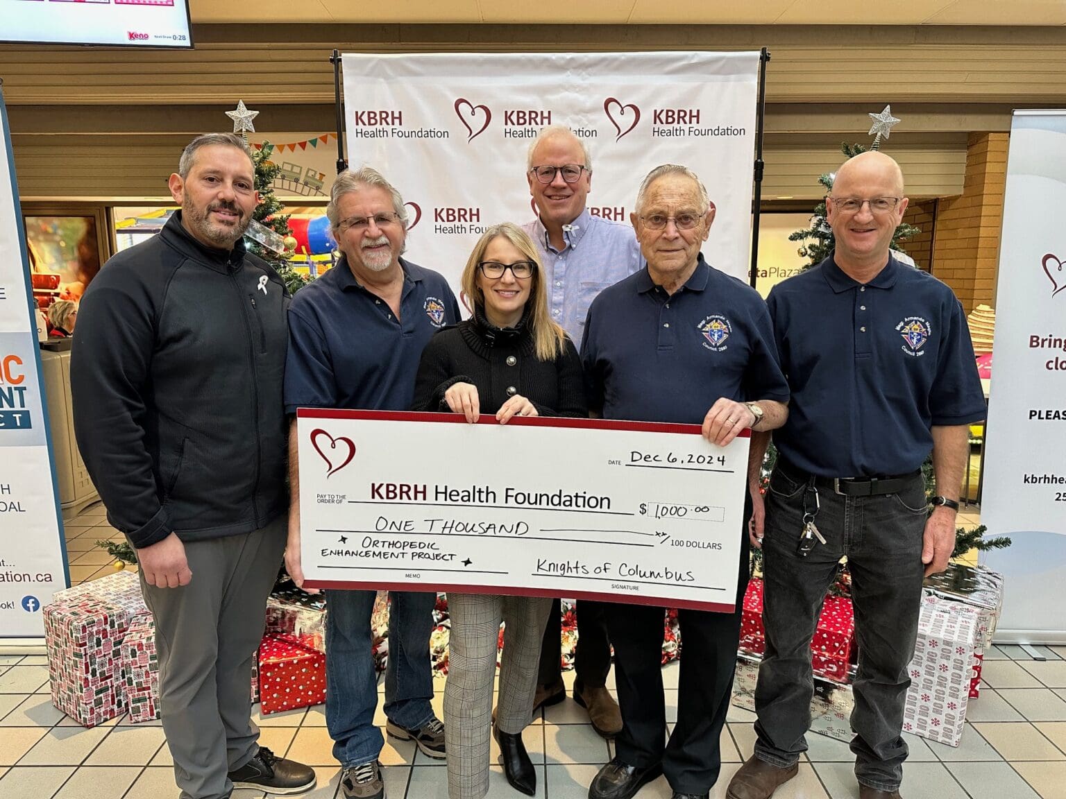 The Knights of Columbus have donated $1,000 to the Orthopedic Enhancement Project during Light-Up the Hospitals! These funds, raised through their pancake breakfasts, will support advanced orthopedic care at KBRH. Rebecca Smyth, KBRH Health Foundation Board Director (centre), accepted the donation from Knights of Colombus members. Thank you for your generosity and commitment to better health care close to home!