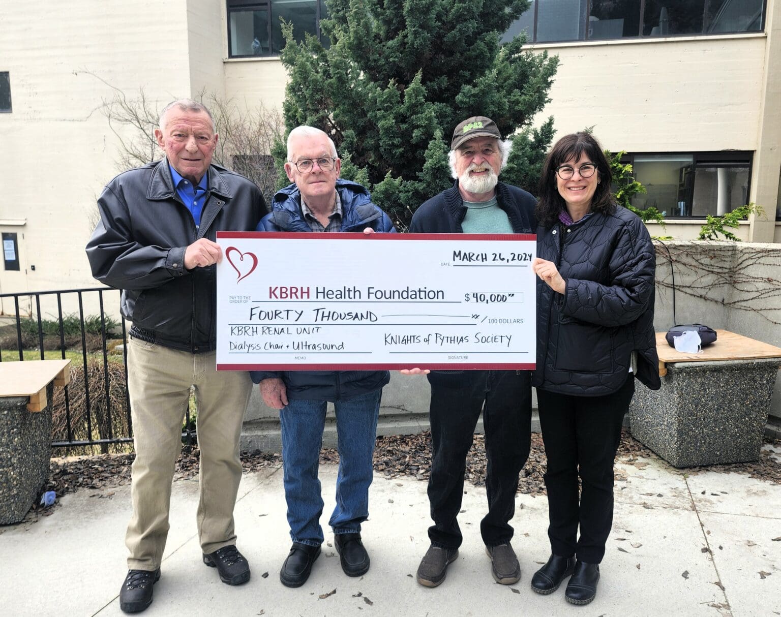 The Knights of Pythias have made an outstanding donation of $40,000 to support the KBRH Renal Department. Their generosity will aid in the purchase of a Dialysis Chair and an Ultrasound with Probes. As the Knights of Pythias work to distribute funds after the sale of their building, the KBRH Health Foundation thanks them for prioritizing our regional hospital and healthcare improvements for residents of the Kootenay Boundary. The Knights of Pythias Members Bert Storvold, Jack Balfour and Ian McLeod present this generous donation to Lisa Pasin, KBRH Health Foundation Executive Director (left to right).
