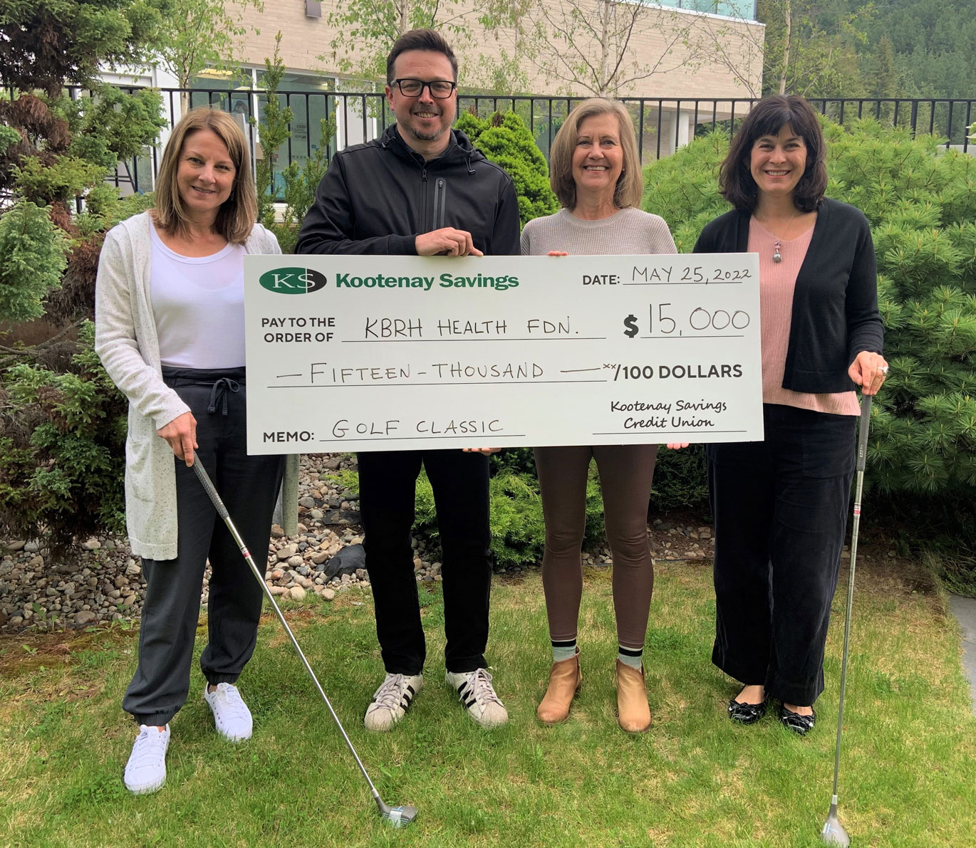 The KBRH Health Foundation is pleased to announce Kootenay Savings as the Signature Sponsor for the 2022 Golf Classic! Kootenay Savings provided $15,000 in sponsorship for this event. Proceeds from this year’s tournament will support the Ambulatory Care Campaign at KBRH. Kootenay Savings representatives Shelly Martin, Marketing Support Representative, Aron Burke, and Community Liaison, presented this generous donation to Foundation representatives Debbie Wood, Board Director and Lisa Pasin, Executive Director (left to right).