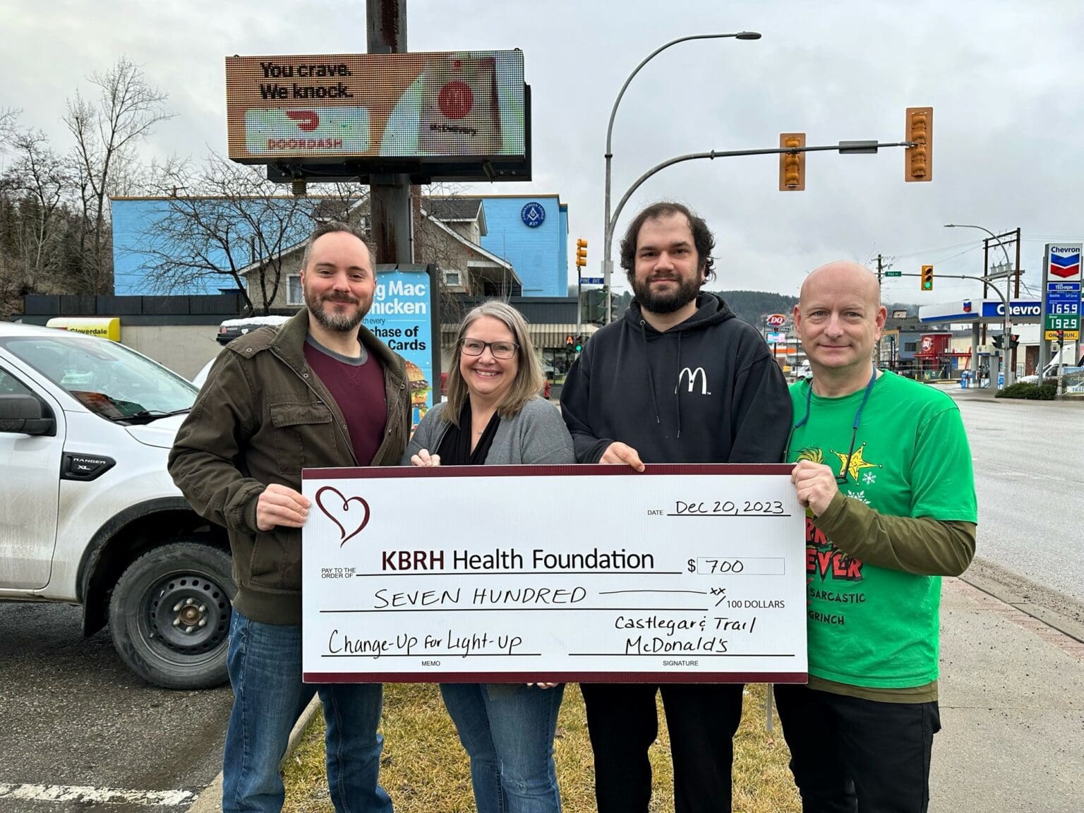 McDonald’s in Trail and Castlegar raised $700 during the Change-Up for Light-Up! campaign. These community donations bring us one step closer to reaching our goal of bringing better care closer to home with the Orthopedic Enhancement Project. KBRH Health Foundation Board Member, Jeffrey Craig accepts this donation from Kathleen Zubick, owner, Ray Carreiro, manager and Brad Zubick, owner of McDonald’s (left to right). We thank you for your support in making a positive impact on healthcare in our community.