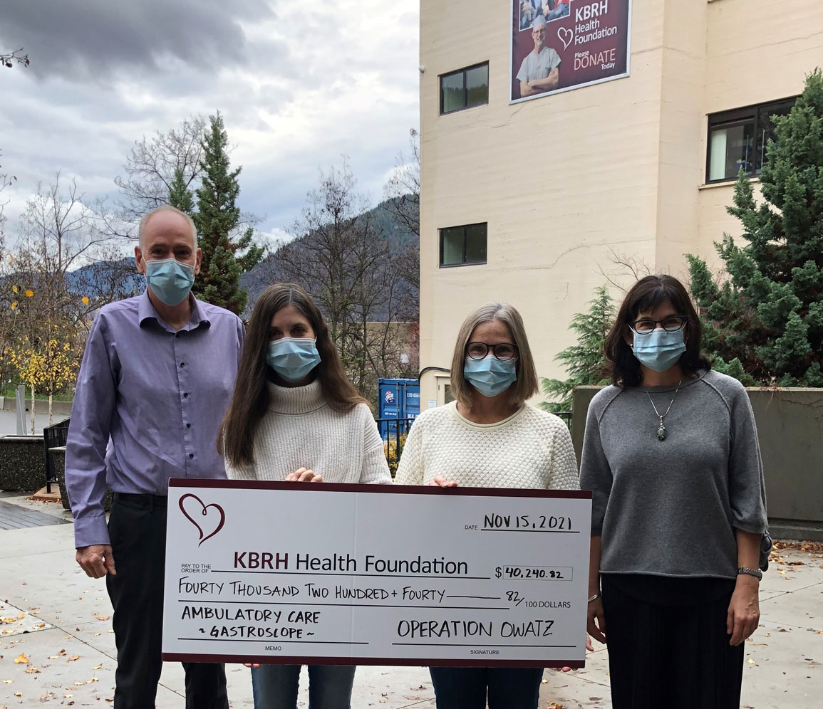 The KBRH Health Foundation was presented with a donation of $40,240 from the proceeds of Operation Owatz. Operation Owatz is a fitness challenge honouring the late Dr. Todd Owatz who advocated for healthy habits with his patients. This donation will support the purchase of a Gastroscope for the Ambulatory Care Department where Dr. Owatz worked as a General Surgeon at KBRH. Sandra Owatz, Dr. Owatz’s wife (left, centre), and Lindy Welsby, Operation Owatz Event Organizer (right, centre) presented this generous donation to Dr. Cameron, General Surgeon at KBRH (left), and Lisa Pasin, Executive Director of the KBRH Health Foundation (right).