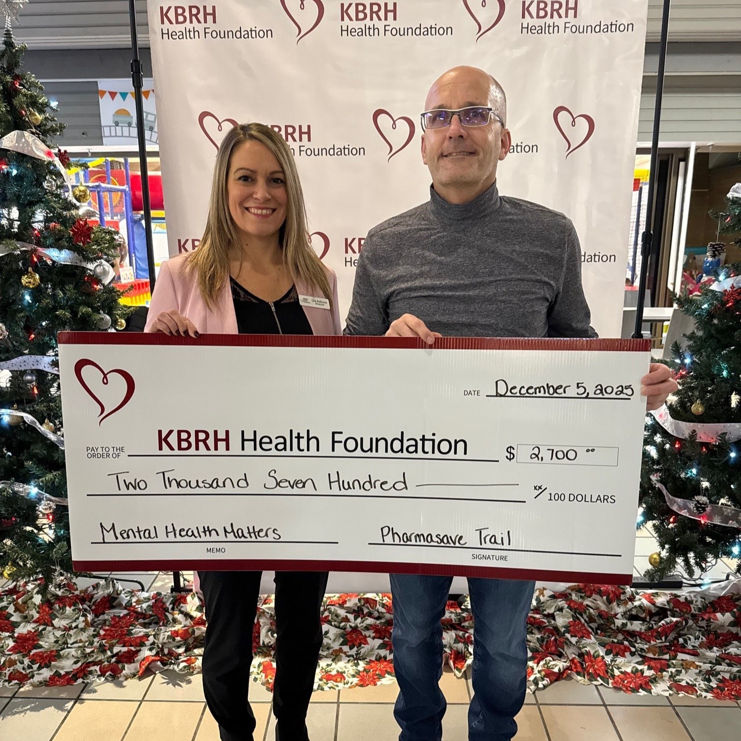 We are grateful to Pharmasave Trail for their generous $2,700 donation to the Mental Health Matters Campaign. These funds were raised through the generosity of Pharmasave Trail Customers who ‘Rounded Up’ at the till in support of Mental Health. Tim Moorhead, Owner of Pharmasave Trail, presented the donation to Lisa Babcock, KBRH Health Foundation Second Vice Chair (right to left). Thank you, Pharmasave Trail and its customers, for supporting local healthcare and helping bring compassionate mental health care closer to home!