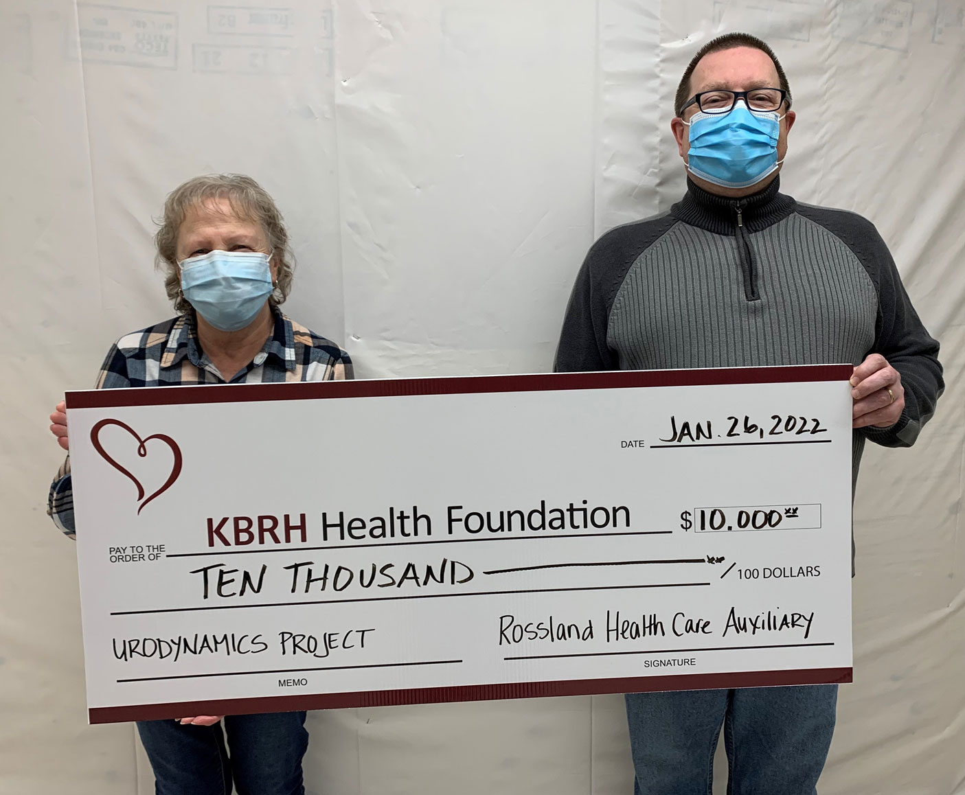 The Rossland Health Care Auxiliary donated $10,000 to purchase equipment for the Urodynamics Program. Urodynamics will enable enhanced diagnostics for those requiring complex urology care. Barb Marsh, Rossland Auxiliary Treasurer presented this donation to Brad Jansen, KBRH Health Foundation Board Member (left to right).