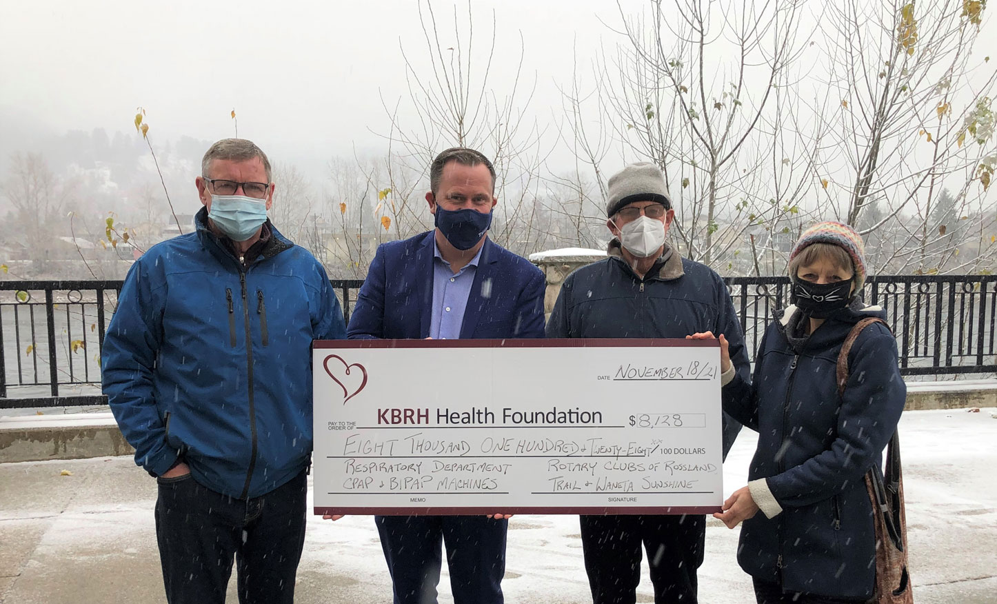 The KBRH Health Foundation received $8,128 from the Rotary Club of Rossland, the Trail Rotary Club and the Rotary Club of Waneta Sunshine. This donation will support the purchase of respiratory equipment used to treat patients with obstructive sleep apnea at KBRH. KBRH Health Foundation Board Director, Paul Butler (centre, left), accepted this donation from Rotary Club of Rossland representative, Mike Ramsey (left), Rotary Club of Trail President, Bruce Fawcett (centre, right), and Rotary Club of Waneta Sunshine representative, Maddy Harlamovs (right).