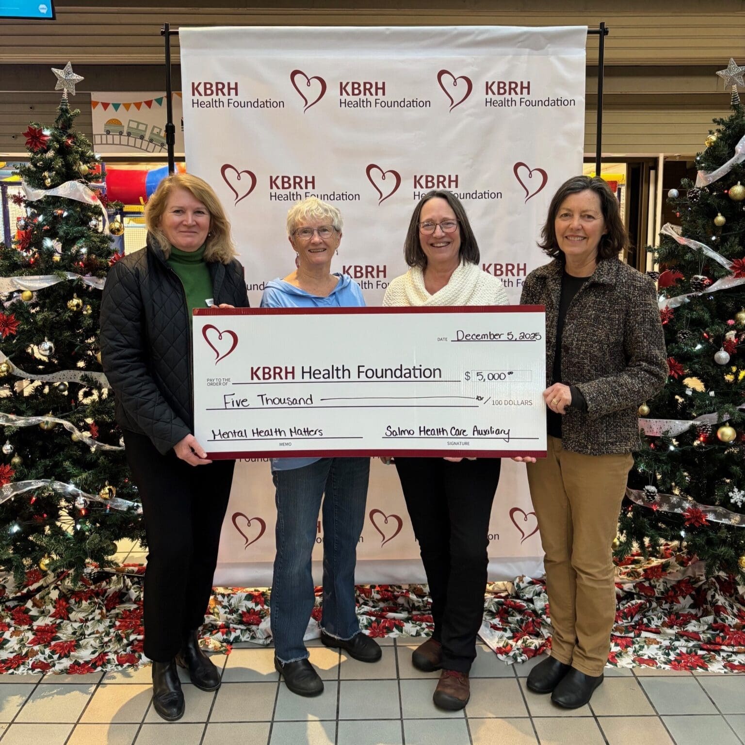 We are grateful to recognize the Salmo & District Health Care Auxiliary Society for their generous $5,000 contribution to the Mental Health Matters Campaign as part of Light-Up the Hospitals! Pledge Day. Made possible through the success of the Salmo Thrift Store and the dedication of Salmo Auxiliary volunteers, this gift will help advance important mental health care improvements across our region, from enhancing patient spaces to supporting recovery and family-focused programs. Andrea Bushore, KBRH Health Foundation Vice Chair, gratefully accepted this thoughtful donation from Sharri, Judi, and Teresa, members of the Salmo Auxiliary (left to right). Thank you to the Salmo & District Health Care Auxiliary Society for your continued commitment to improve healthcare close to home.