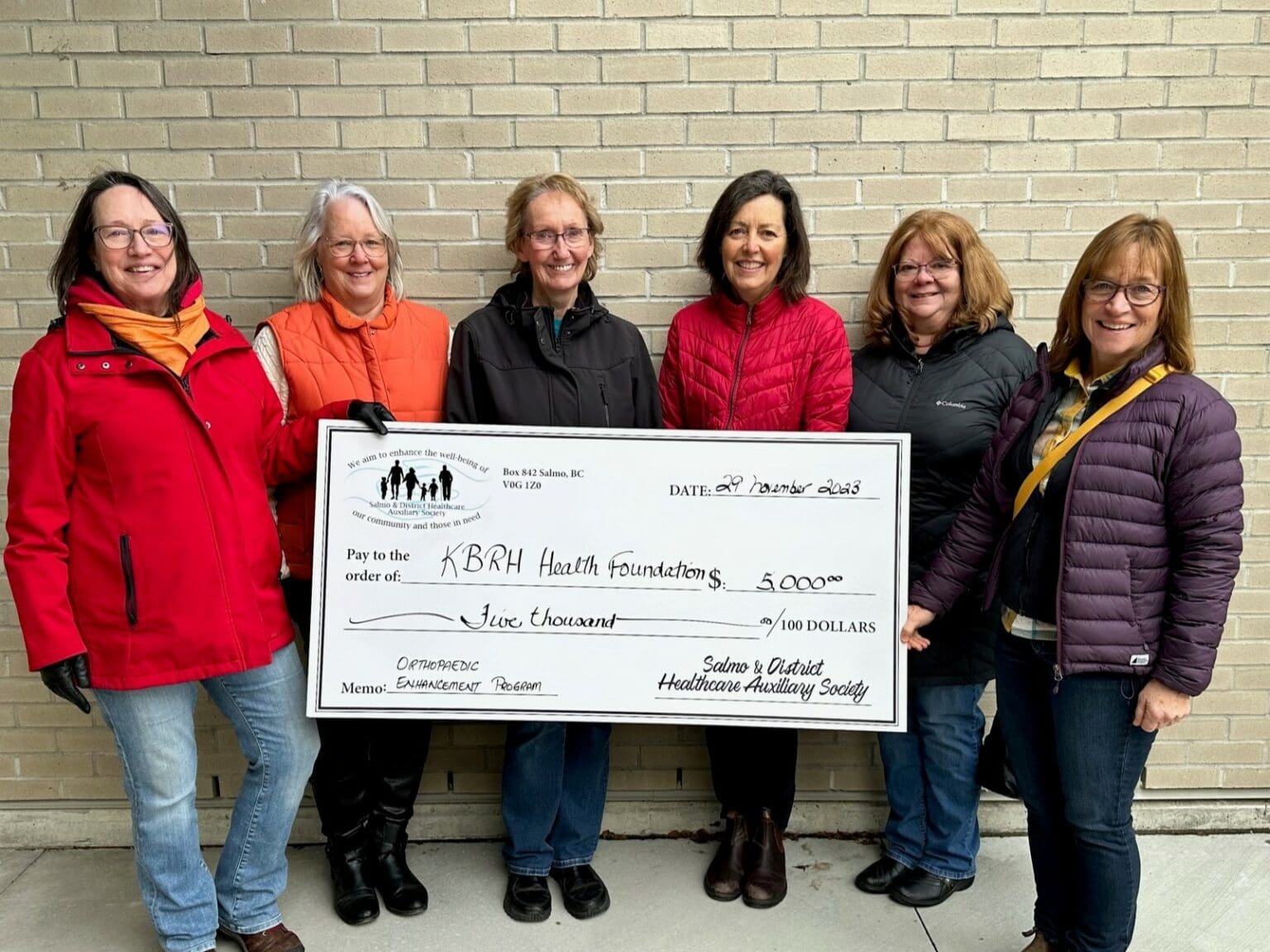 Salmo & District Healthcare Auxiliary Society has generously donated $5,000 towards the Orthopedic Enhancement Project to support Light-Up The Hospitals! and the KBRH Health Foundation’s month of giving which occur annually in December. This donation is made possible through sales at the Salmo Thrift Store and the hard work and dedication from their volunteers. The KBRH Health Foundation is grateful to the Salmo Auxiliary for supporting the regional Orthopedic Enhancement Project, which will improve orthopedic care in the Kootenay Boundary. Salmo & District Healthcare Auxiliary members, Judi Cozzetto, Lynn Gail, Ardeth Speers, Teresa Olleck, and Kathy Manning, present this contribution to Joanne Weninger, KBRH Health Foundation Board Member (left to right).
