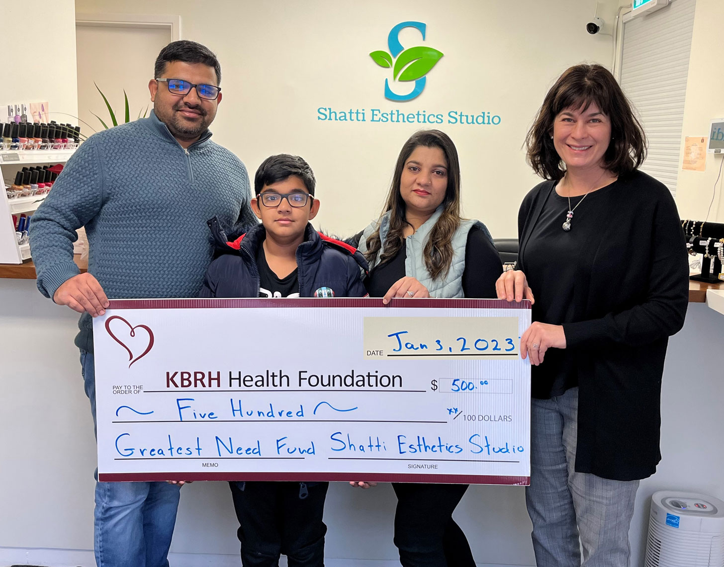 Shatti Esthetics Studio has donated $500 to the KBRH Health Foundation’s Greatest Need Fund. Owners, Sukhjinder and Shatti Singh, and their son Agam, present their donation to Lisa Pasin, KBRH Health Foundation Executive Director (left to right). Donations to the Greatest Need Fund assist in purchasing priority medical equipment as well as patient care and comfort items for any department at KBRH, Columbia View Lodge, Poplar Ridge Pavilion or Community Health.