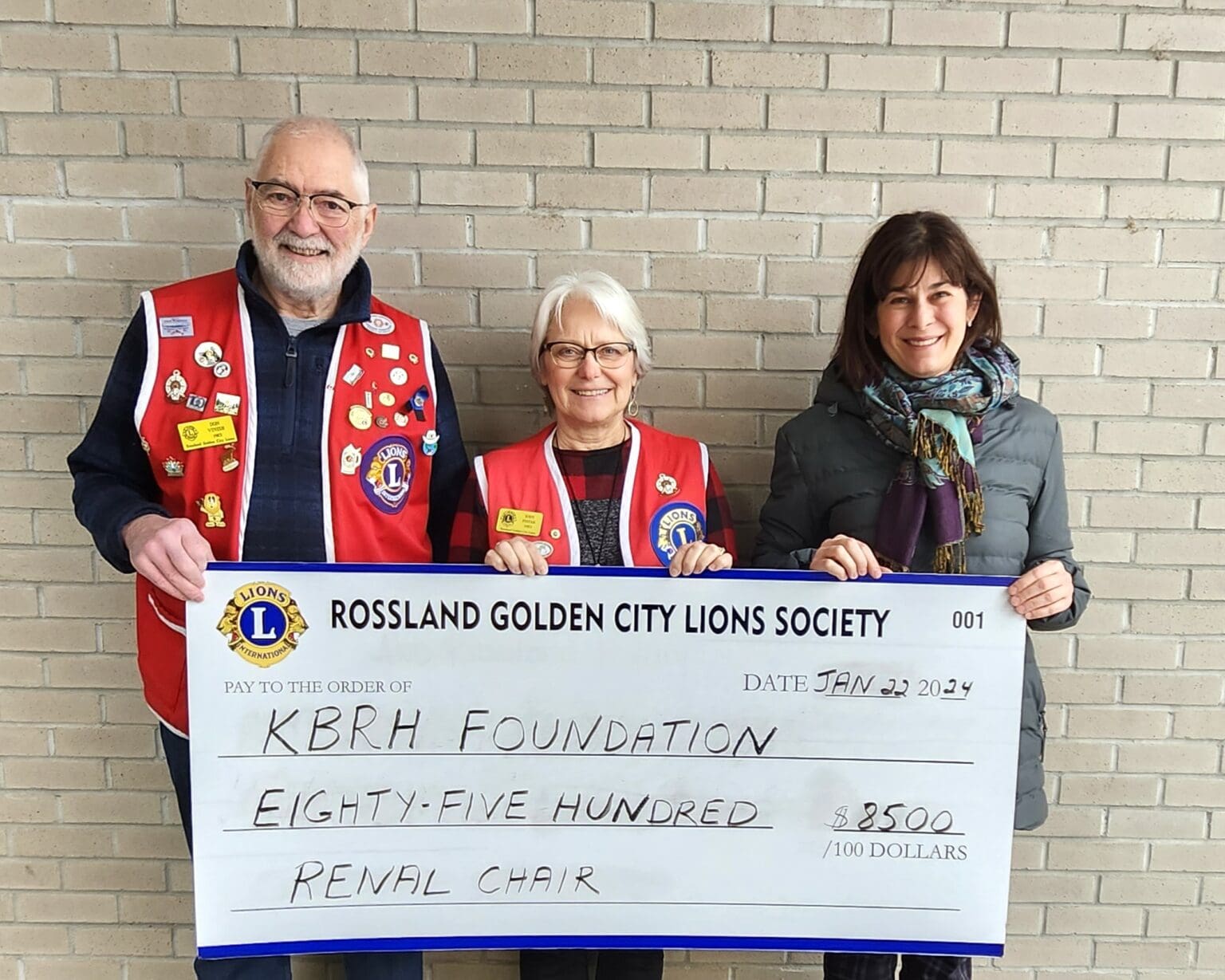 The Rossland Golden City Lions Society has made a significant donation of $8,500 to purchase a dialysis chair for the KBRH Renal Unit. This specialized chair ensures patient comfort and safety when receiving dialysis treatments, which is so very important during lengthy visits. Don Vinish and Jody Pistak, Rossland Golden City Lions members present this gift to Lisa Pasin, KBRH Health Foundation Executive Director (left to right). The Rossland Golden City Lions Society, active since 1976, is currently recruiting for new members. If interested in joining, please contact Jody Pistak at 250-368-7623.