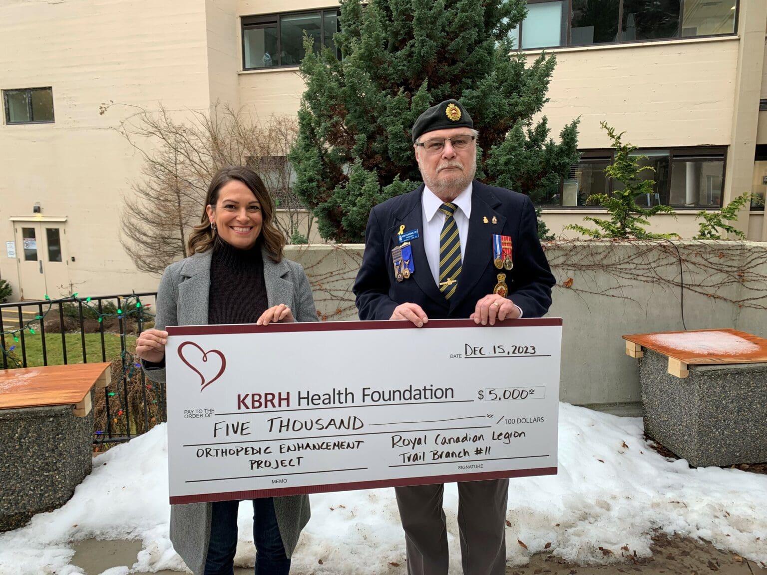 The Royal Canadian Legion Trail Branch #11 has made a $5,000 donation from their Poppy Fund to the Orthopedic Enhancement Project to purchase medical equipment for the operating rooms at KBRH. Terry McKimmie, President of the Trail Branch #11 presents this donation to Lisa Babcock, KBRH Health Foundation Board Member (right to left).
