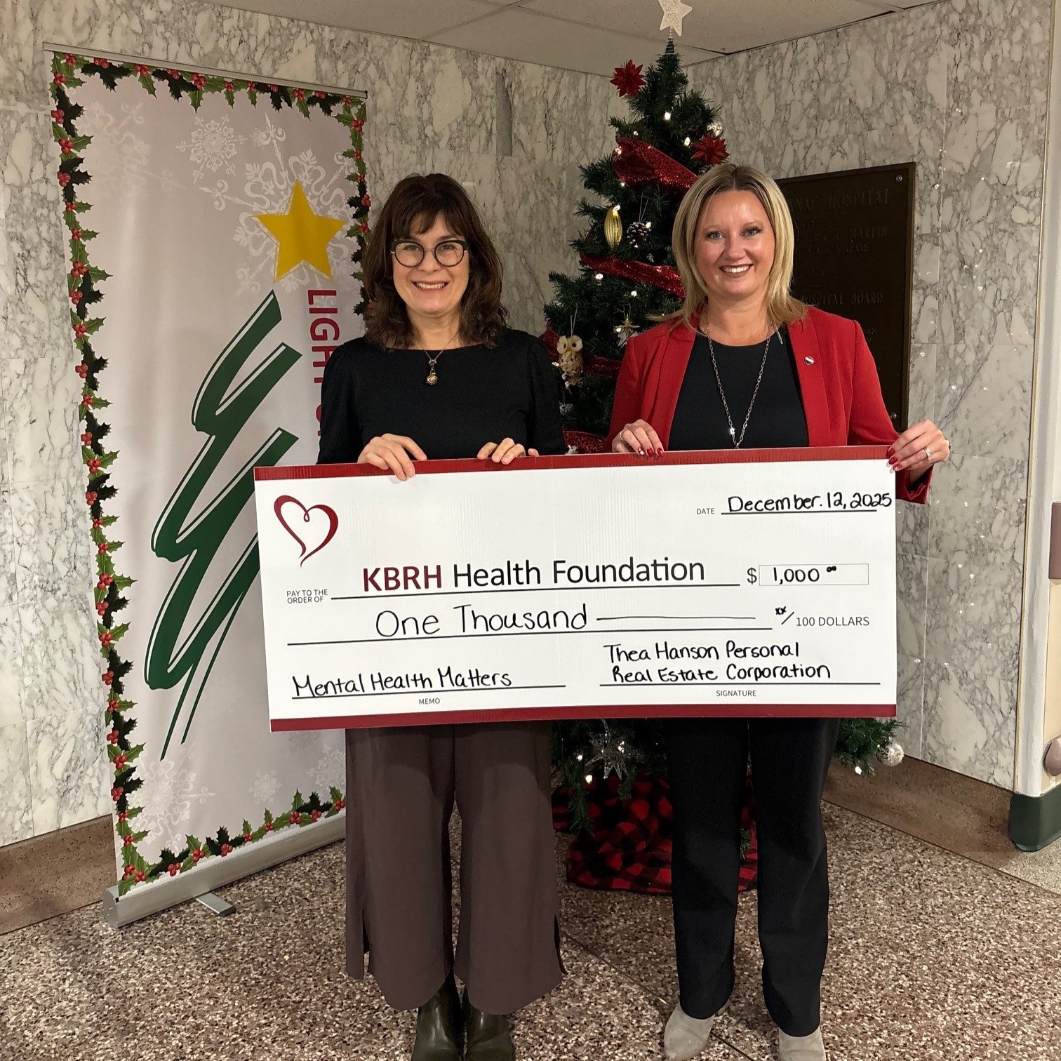 Thea Hanson Personal Real Estate Corporation has contributed $1,000 to the Mental Health Matters Campaign. This gift will help enhance mental health spaces such as the Daly Pavilion and Harbour House by providing new furniture, updated security systems, and therapeutic resources that support recovery and community reintegration. Lisa Pasin, Executive Director of KBRH Health Foundation, gratefully accepted the donation from Thea Hanson (left to right). Thank you, Thea, for helping strengthen mental health care in our region!
