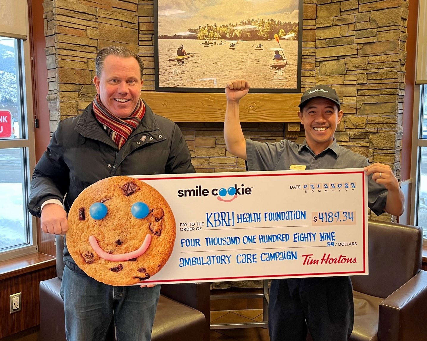 Tim Hortons Trail donated $4,189.34 to the KBRH Health Foundation’s Ambulatory Care Campaign. Proceeds were raised through their annual Smile Cookie Campaign. Tim Hortons’ Trail Manager, Angelo Caraos presented this donation to Paul Butler, KBRH Health Foundation Board Director (right to left).