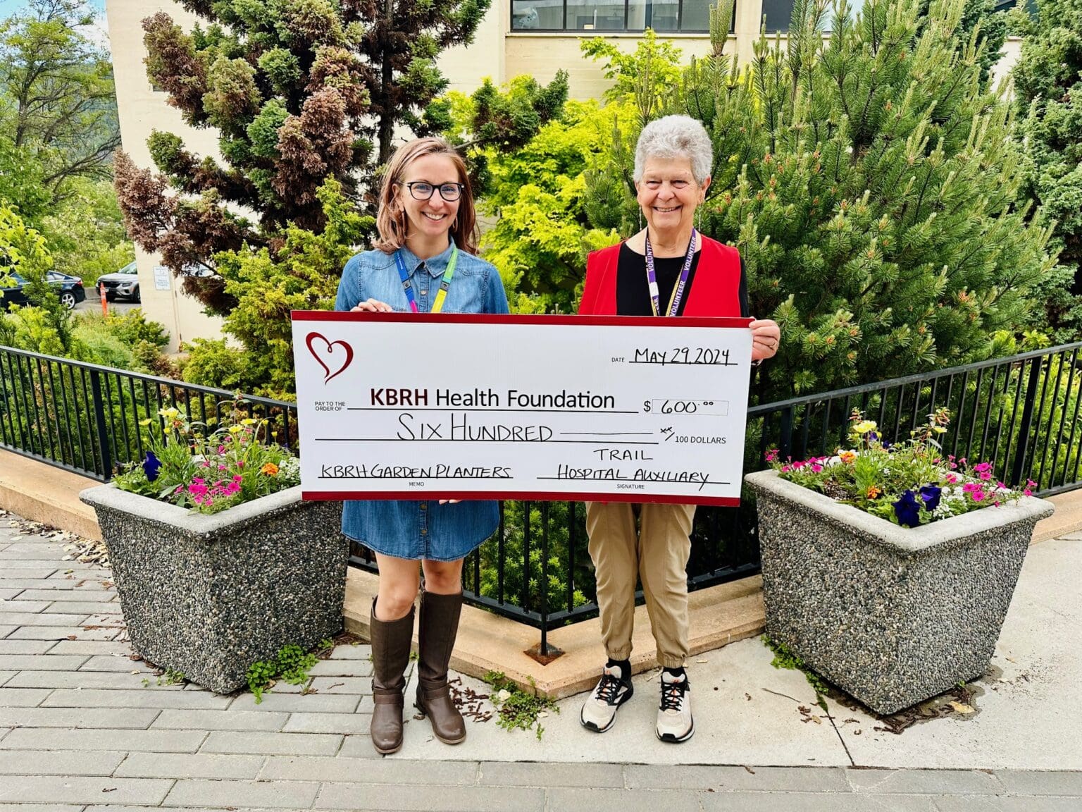The Trail Hospital Auxiliary has generously donated $600 in support of the KBRH Garden Project. This contribution ensures the planters are beautiful and the front entrance welcoming at KBRH. Andrea Dutchak, KBRH Health Foundation Board Member gratefully accepts this gift from Judy Aldridge, Trail Hospital Auxiliary President (left to right). Thank you, Trail Hospital Auxiliary, for your ongoing support and dedication to improving our hospital environment!