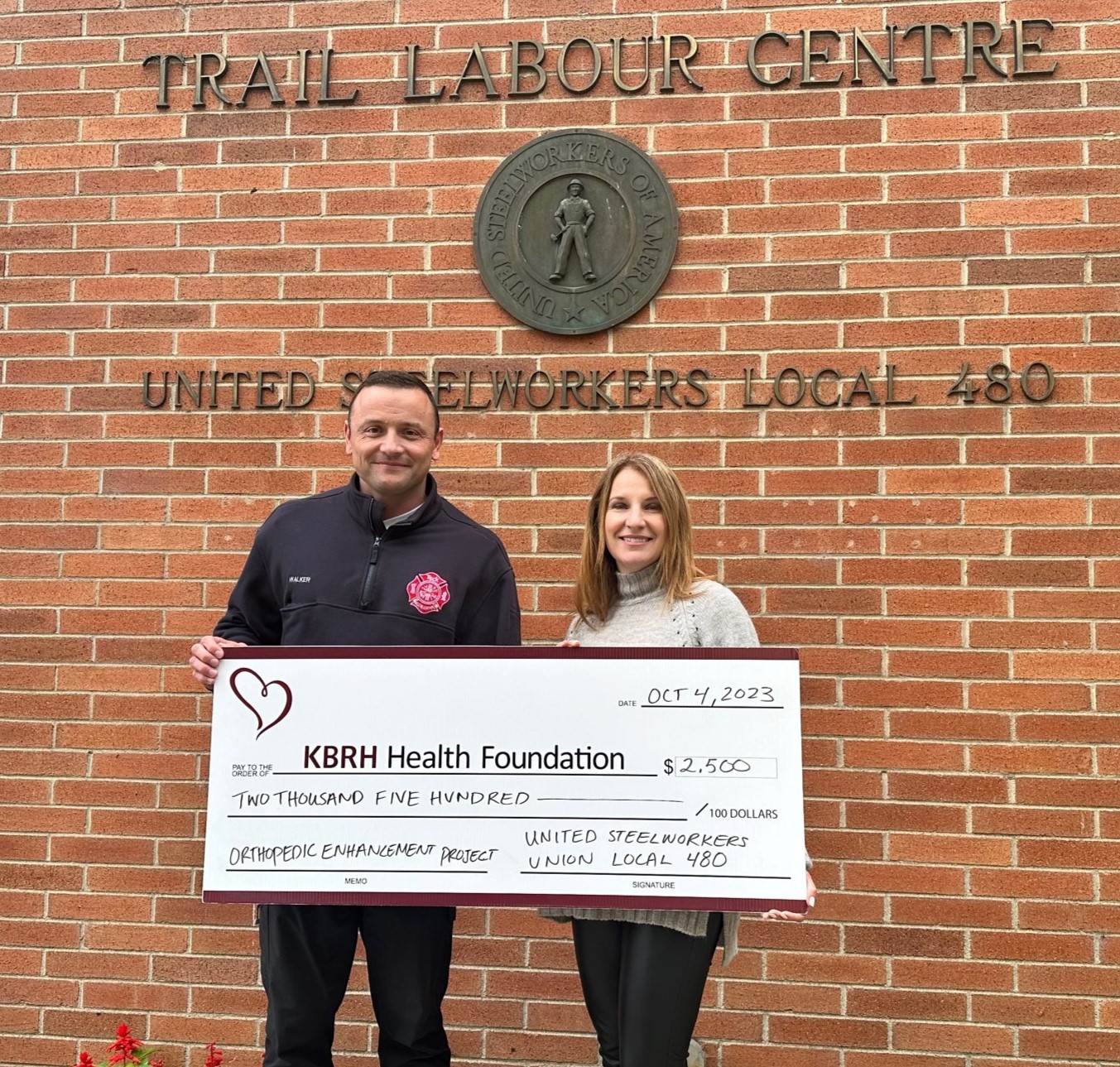 The United Steelworkers Union Local 480 has donated $2,500 to the KBRH Health Foundation’s Orthopedic Enhancement Project. This donation will help purchase priority medical equipment for the orthopedic surgeons at KBRH and help bring better care closer to home. Local 480 president, Chris Walker, presents this generous donation to Rebecca Smyth, KBRH Health Foundation Board Member (left to right).