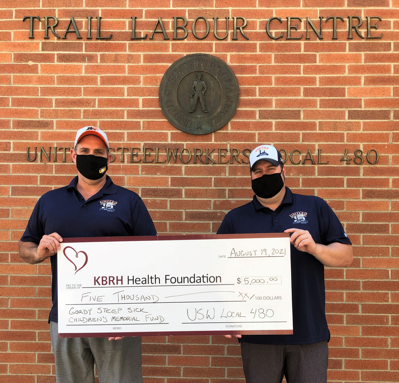 USW Local 480 donated $5,000 to the Gordy Steep Memorial Sick Children’s Fund, which assists families travelling to access medical care for their child. Funds were made possible through the generous contributions of the members of USW Local 480. Jeff Schuepfer, USW Benefits Coordinator (left), and Nylan Lafreniere, USW Safety Coordinator (right), presented this donation to the KBRH Health Foundation.