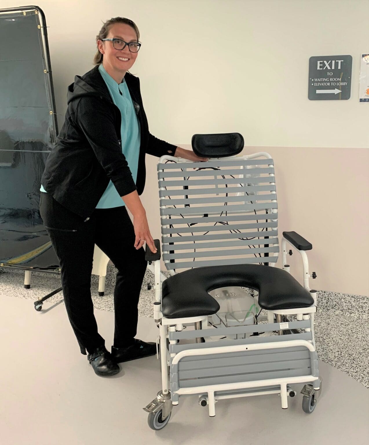 A Bariatric Tilt Commode was purchased for the Intensive Care Unit to help larger patients maintain dignity and the ability to be ceiling lifted, if necessary, to a bedside toilet. This improves safety for critically ill patients and their caregivers. Jolene, ICU RN, shows us this equipment.