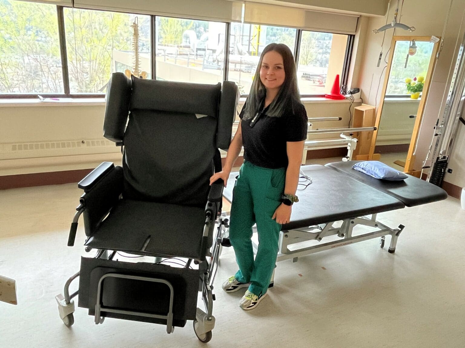 Chelsie, a Rehabilitation Assistant at KBRH, displays a Broda Bariatric Wheelchair that the Foundation purchased with your donations. She shares that staff and patients are grateful for the wheelchair as it has been very useful in helping patients get out of bed and sit upright to eat or visit with their families. This wheelchair helps minimize injury, wounds and infections, while providing dignity and mobility to the user. Thank you to all our donors, who are helping improve healthcare in the Kootenay Boundary region.
