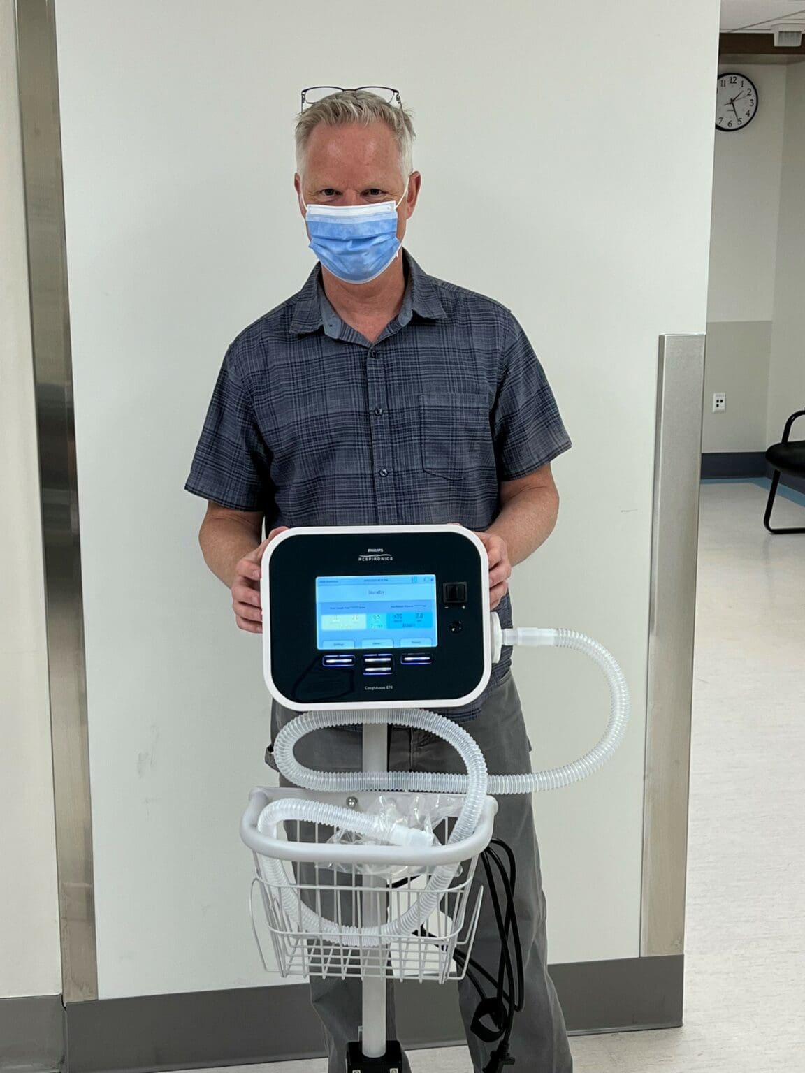 The machine that Greg, the Professional Practice Leader in Respiratory Services is displaying, is called a Cough Assist Device and was purchased with your donations. It assists patients with neuromuscular diseases, such as Muscular Dystrophy who can’t take a large breath in. It assists them in taking a larger breath in so they can generate a more effective cough. Every donation, no matter how small, has great impact, and we are so thankful for all the wonderful donors we have that support our mission.