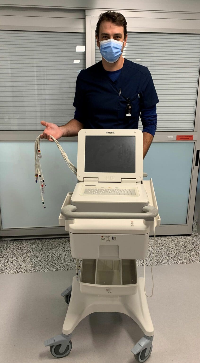Cody, an ICU nurse, shows us a 12-Lead ECG that was purchased through your donations. This portable ECG with blue tooth capabilities allows ICU medical staff to perform ECGs at the bedside for critically ill patients. Data can also be inputted on the run, as our healthcare heroes work to meet the needs of the most critically ill patients at KBRH.