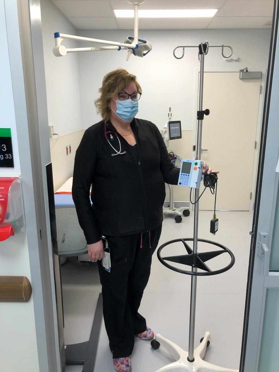 Your donations have provided new IV infusion pumps for the Emergency Department at KBRH. An infusion pump is a medical device that delivers fluids such as nutrients and medications into a patient’s body in controlled amounts. Paula, Emergency Department nurse, displays one of the pumps in the new Emergency Department treatment room.