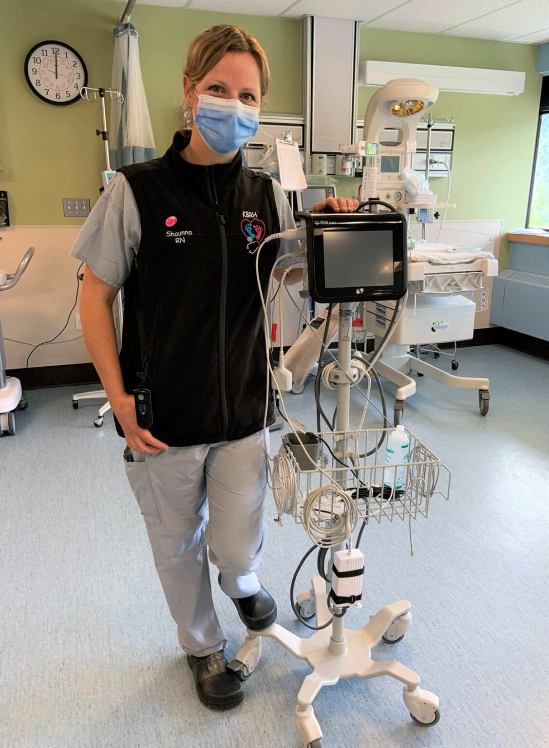 Shaunna, KBRH RN, shows us a Qube Mini Monitor for use in the nursery. This new equipment helps Maternity and Pediatric staff closely monitor the tiniest patients at KBRH.