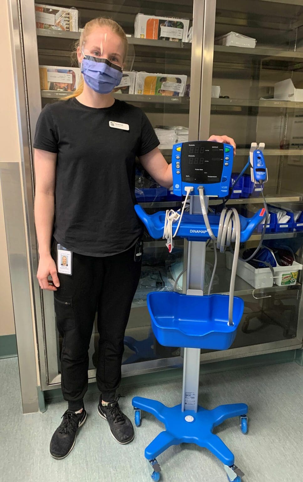 Savannah, a registered nurse from the KBRH Oncology Unit, shows us their new V100 vital signs monitor. Vital signs monitors continuously monitor a patients heart rate, blood pressure and oxygenation during treatments, which improve patient safety.