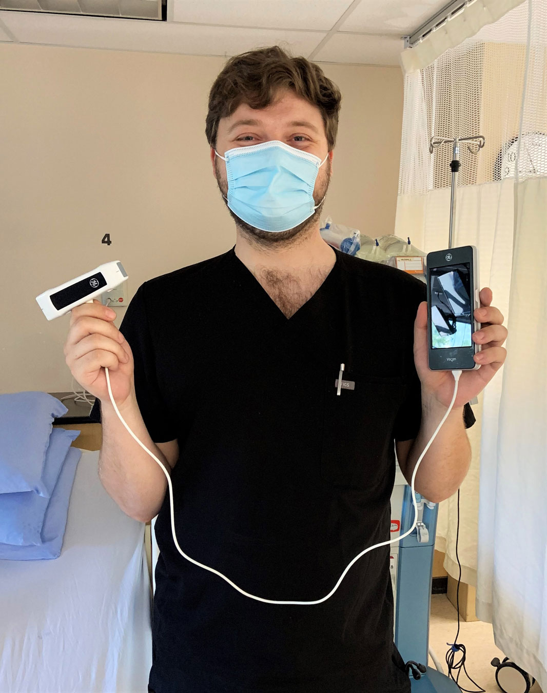 Doug, LPN, shows us a Vscan hand held ultrasound which allows KBRH nursing staff to visualize blood vessels to insert needles with accuracy prior to dialysis. This equipment decreases risk and discomfort to the patient and increases effective and safe dialysis.