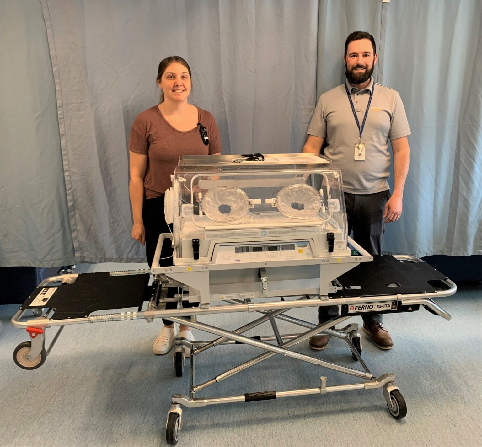 Kaillie, Patient Care Coordinator for Maternity/Pediatrics and Shane from Biomed show us a Transport Incubator purchased through the generosity of the Sandra Schmirler Foundation. The incubator is used to transport critically ill neonatal patients between hospital sites if advanced care is needed. The incubator maintains optimal ambient temperature and provides oxygenation and ventilation to critically ill babies.